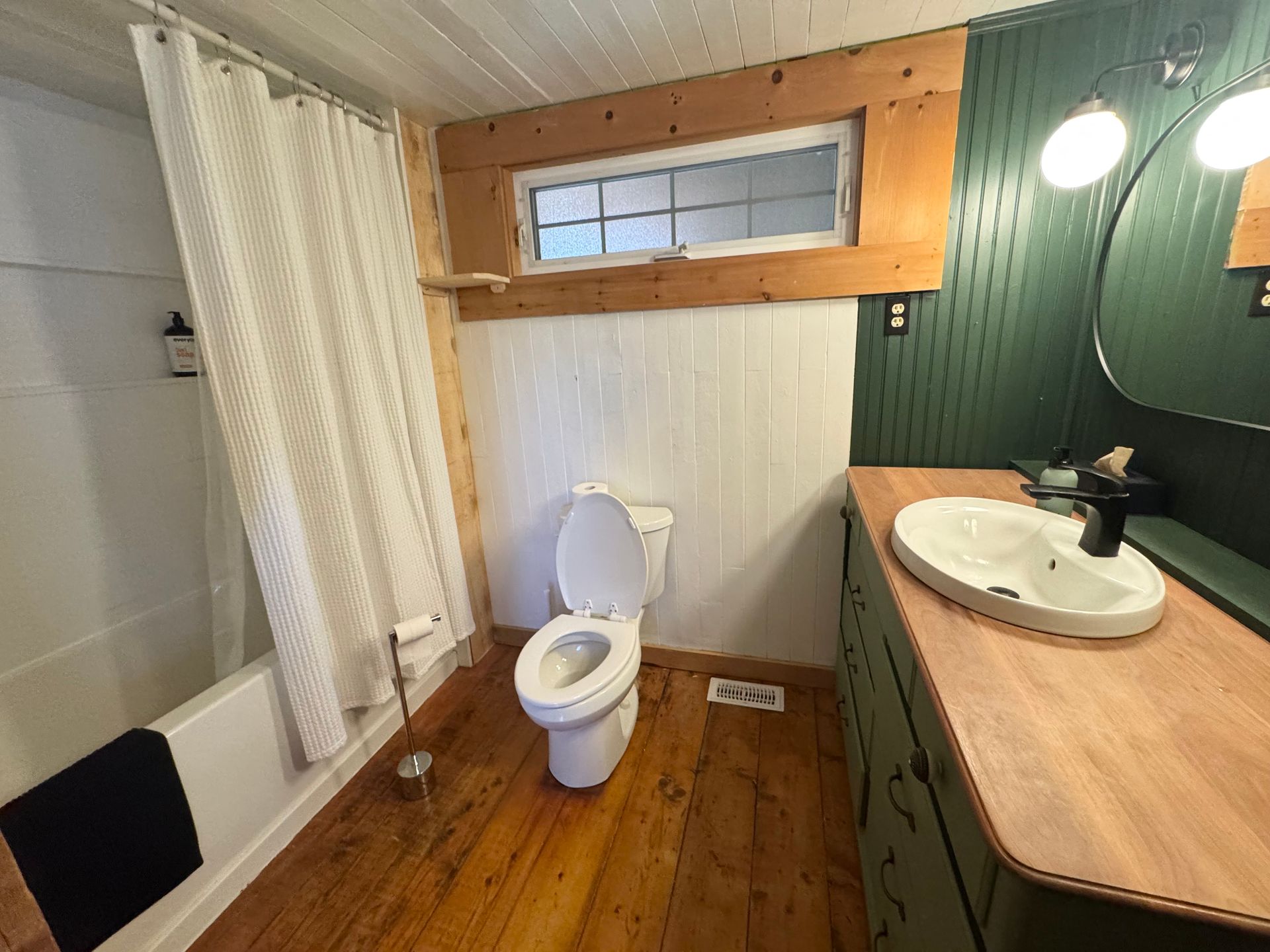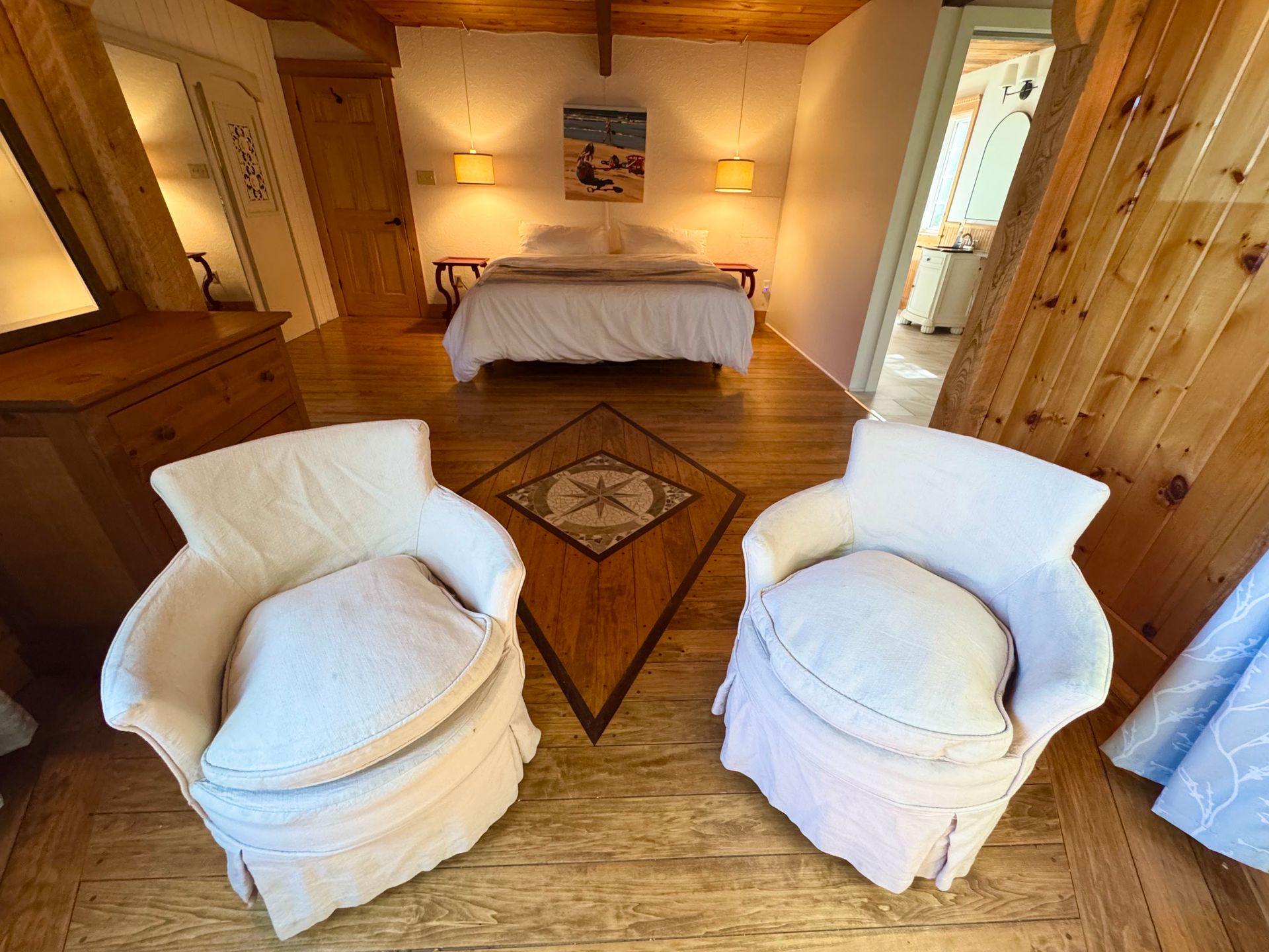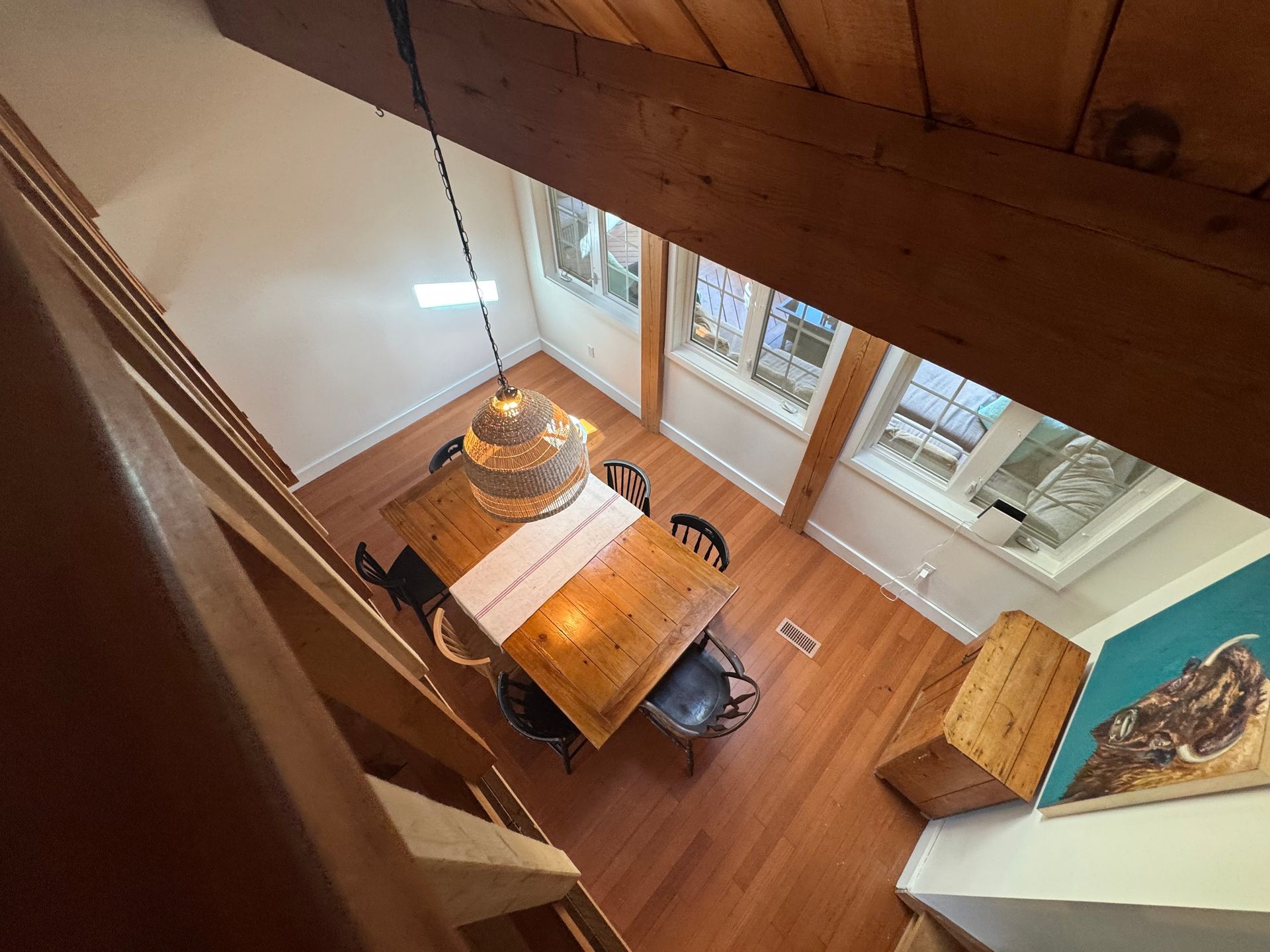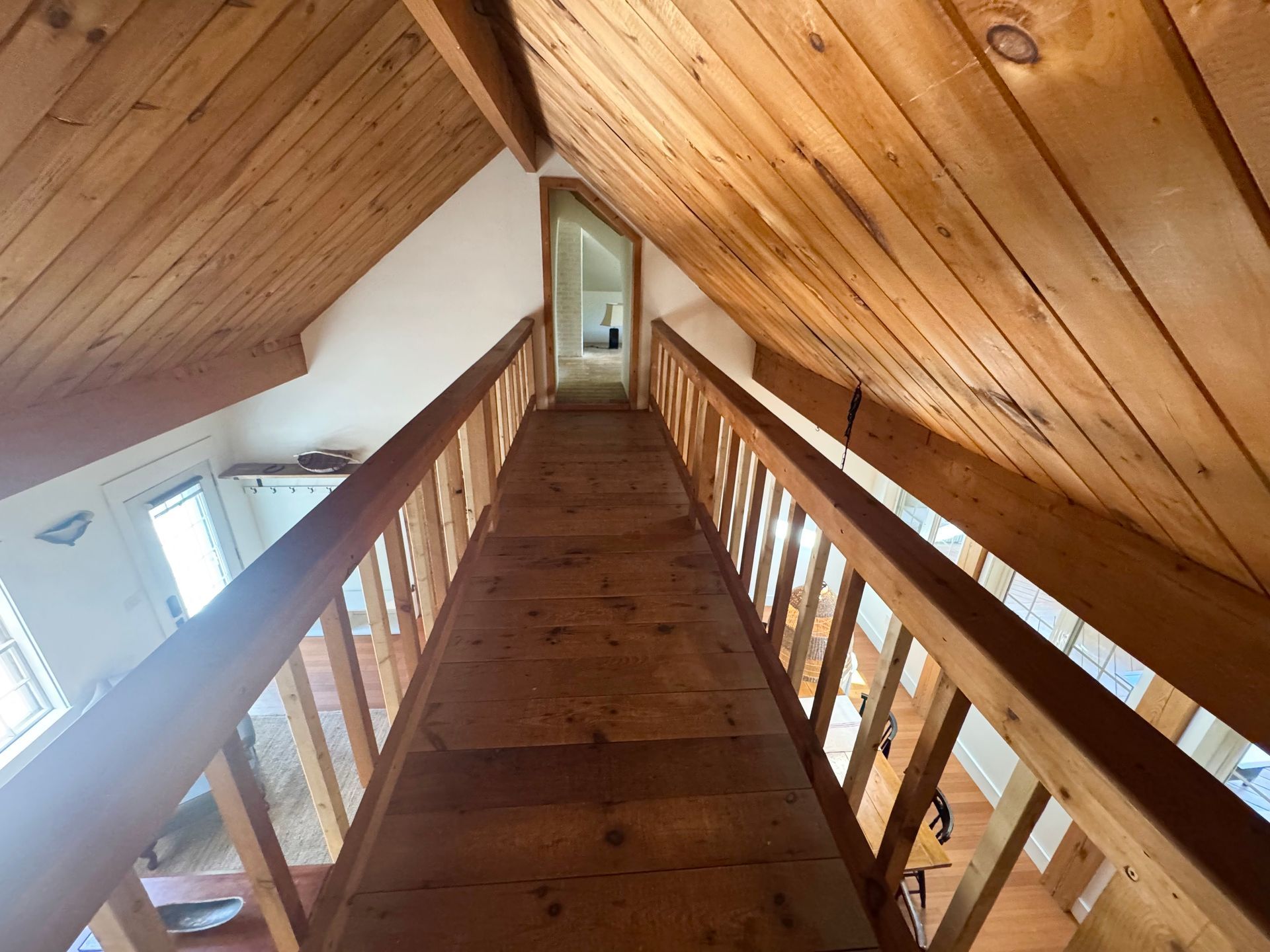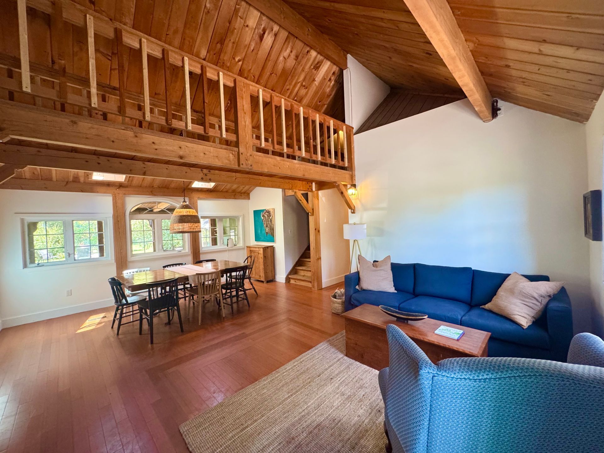 Inside, you’ll find stunning post-and-beam vaulted ceilings and an open-concept layout that creates a welcoming atmosphere reminiscent of an “old English cottage.”