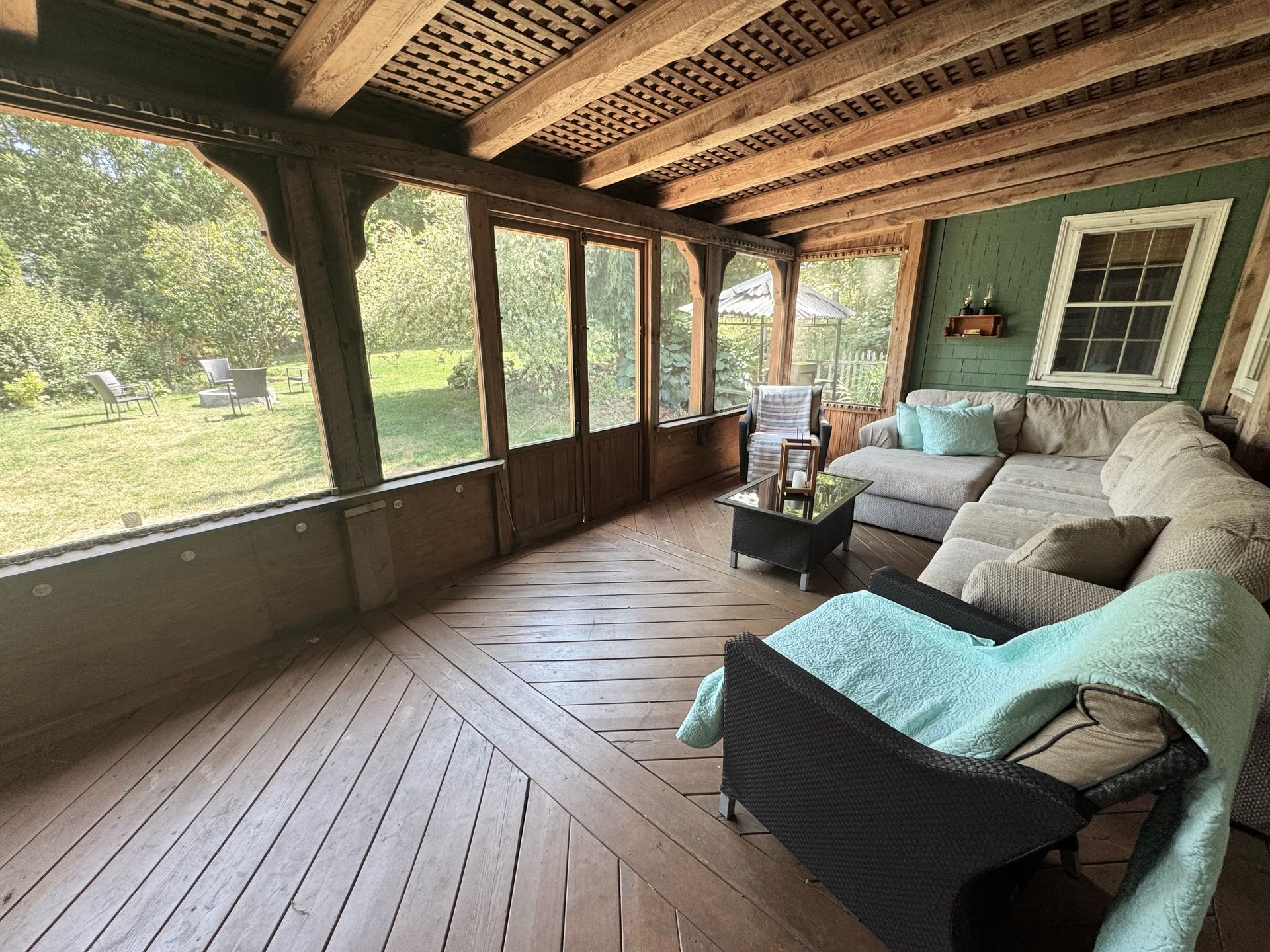 The great room features a unique wooden bridge-style walkway that flows seamlessly into a character-filled kitchen, complete with an exposed brick chimney, apron sink, spacious pantry, updated bathroom, and a breakfast bar that opens to the living area. There’s also a cozy entertainment room with a fireplace and a peaceful screened-in patio at the back entrance—an ideal spot to unwind.
