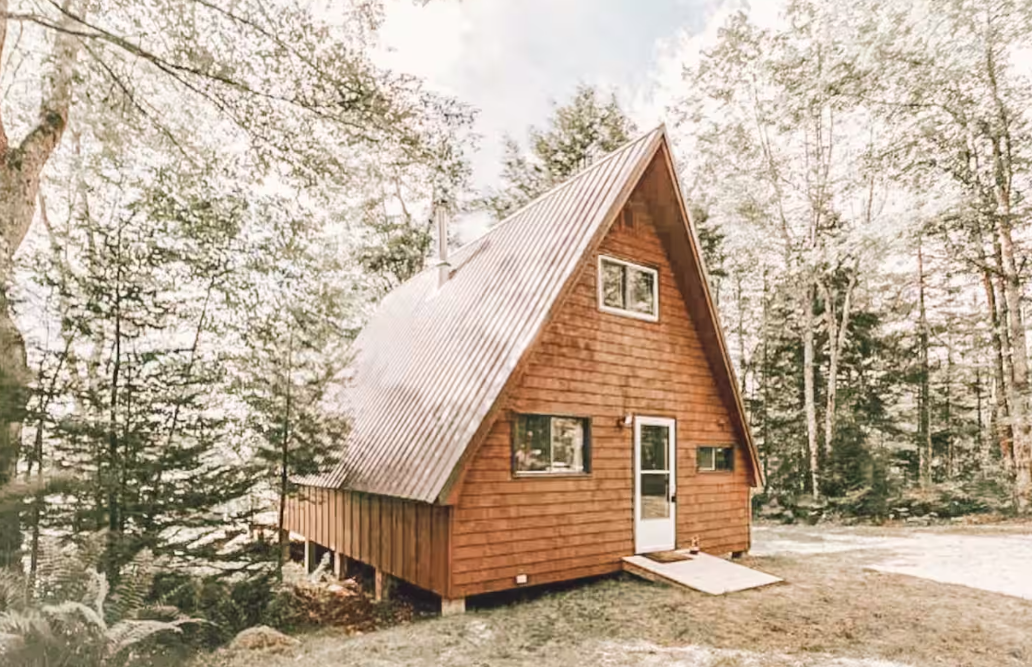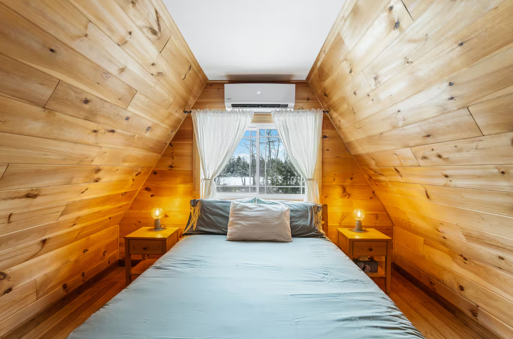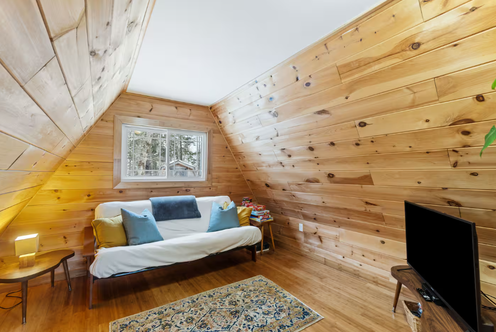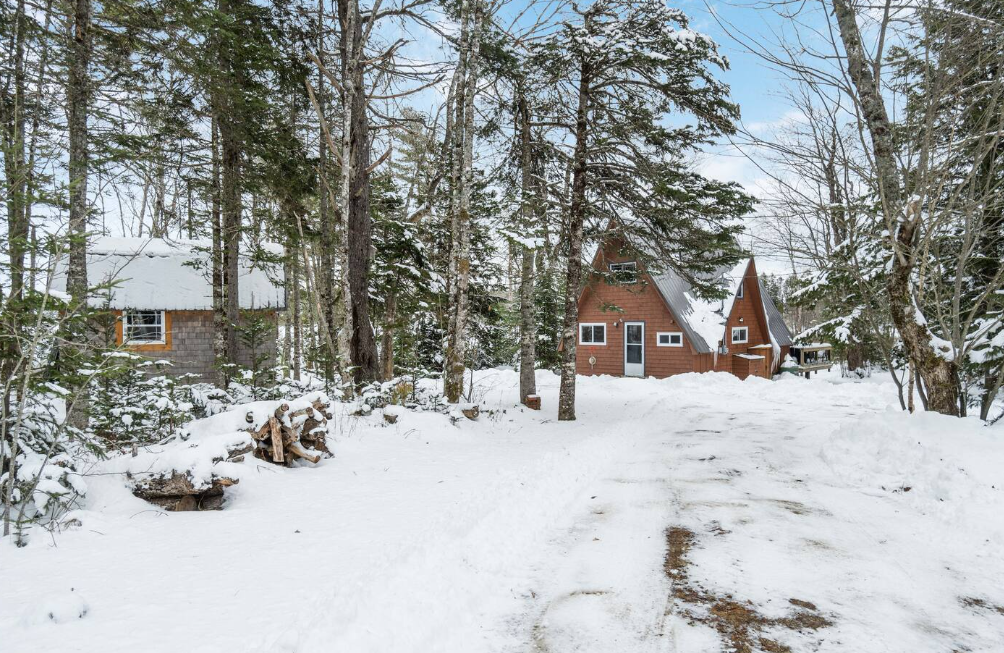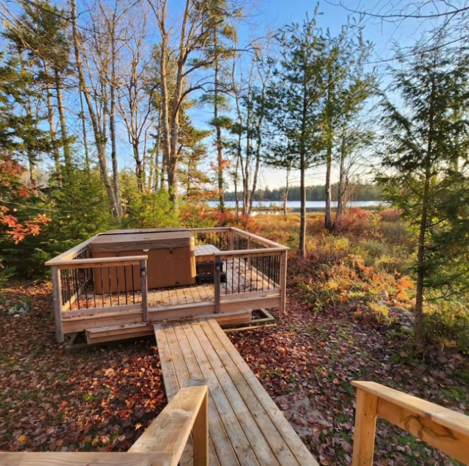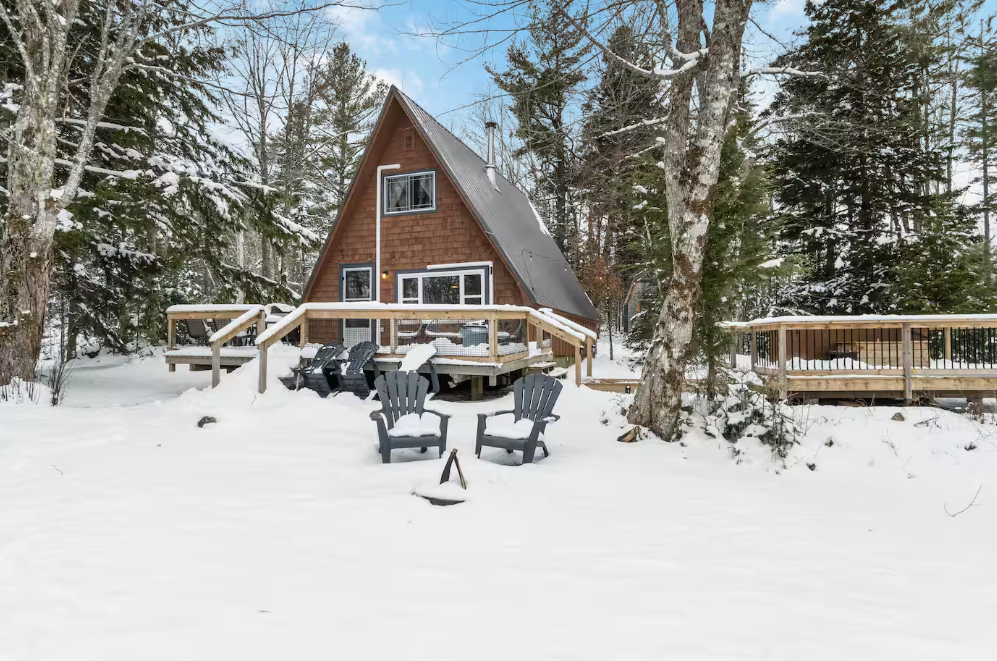 The A Frame includes one main floor bedroom with queen bed, and the upstairs includes both a second bedroom with queen bed and loft area with sofa-bed. There is a full bath with standup shower, open concept kitchen and dining area. The living room on the main floor features a wood stove. Outside you will find a large patio with BBQ and dining chairs, and a fire pit with seating to gather at night. The lakefront is visible from the patio and hot tub, but is a marsh so is more intended for a view and not easily accessible.