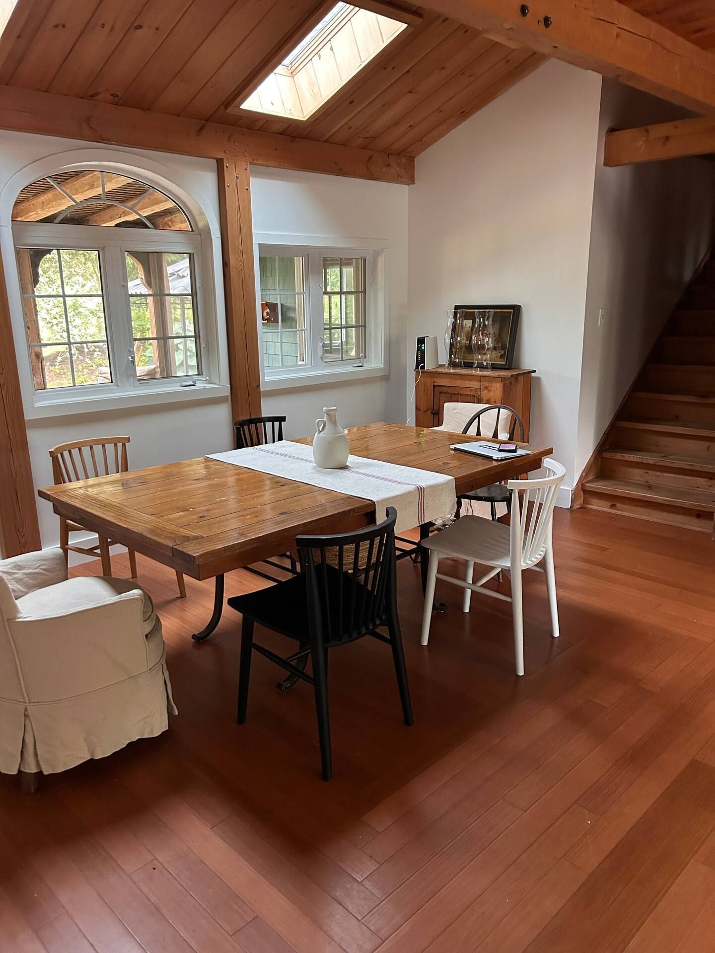 Step inside to soaring post-and-beam vaulted ceilings and a bright, open-concept layout that evokes the charm of an old English cottage—warm, inviting, and full of character.