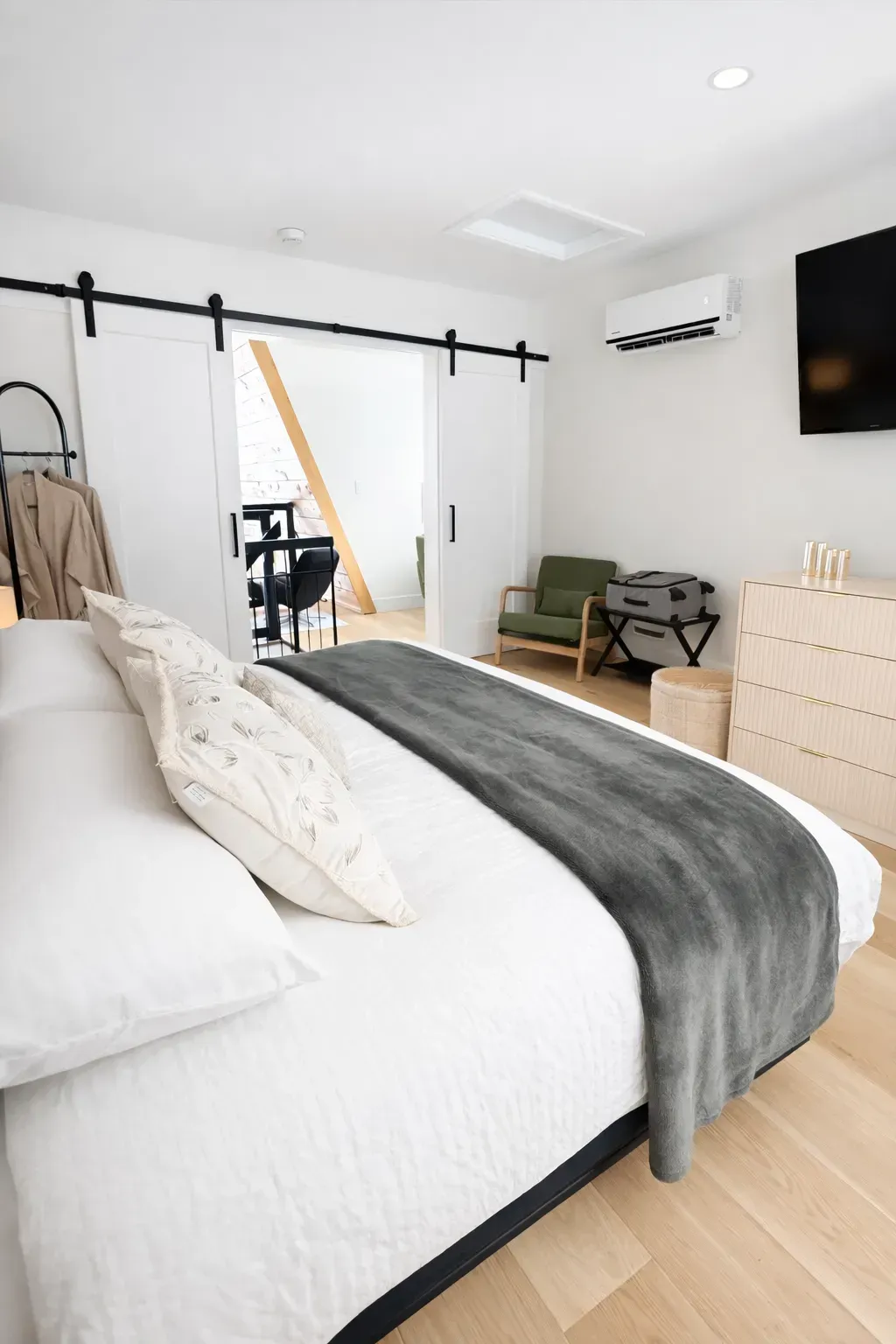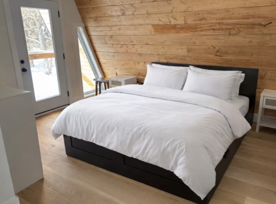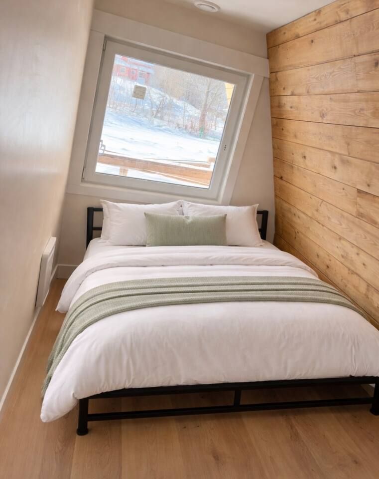 The chalet comfortably sleeps up to 6 guests. Upstairs, you’ll find a spacious king bedroom with a patio, along with a convenient half bathroom. The lower level offers a cozy bedroom with a queen bed, a pull-out sofa, and a full bathroom—ideal for families or small groups.
